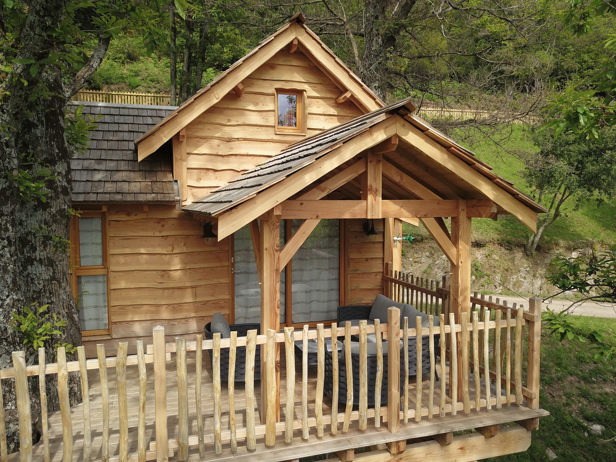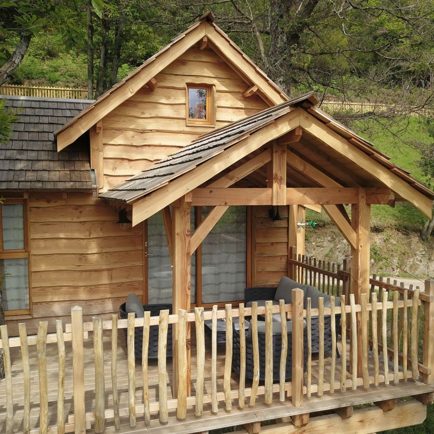 Au cœur de la châtaigneraie privée se nichent dans les arbres des cabanes accessibles par passerelles sécurisées.