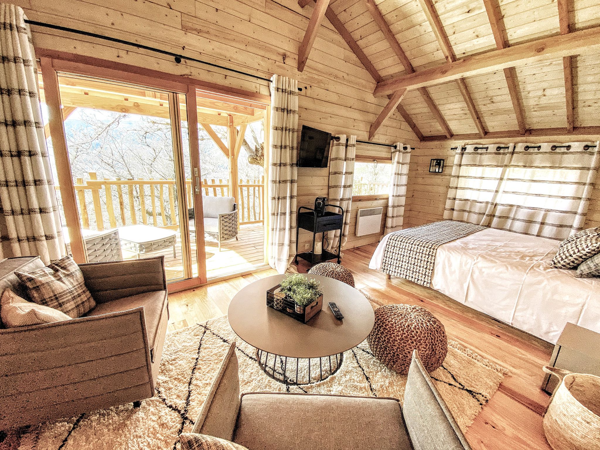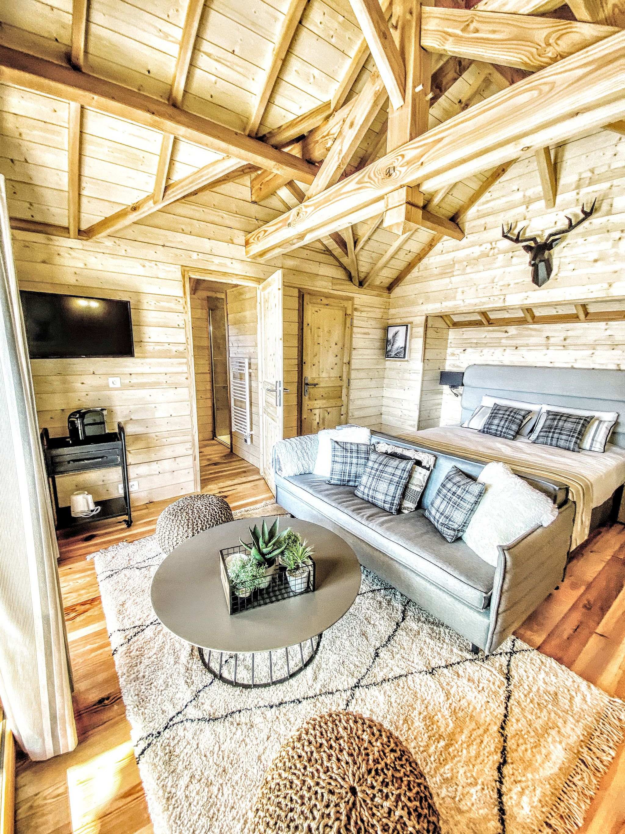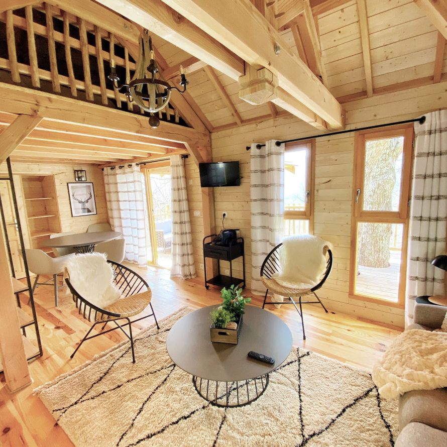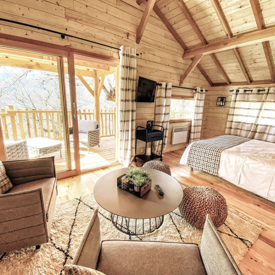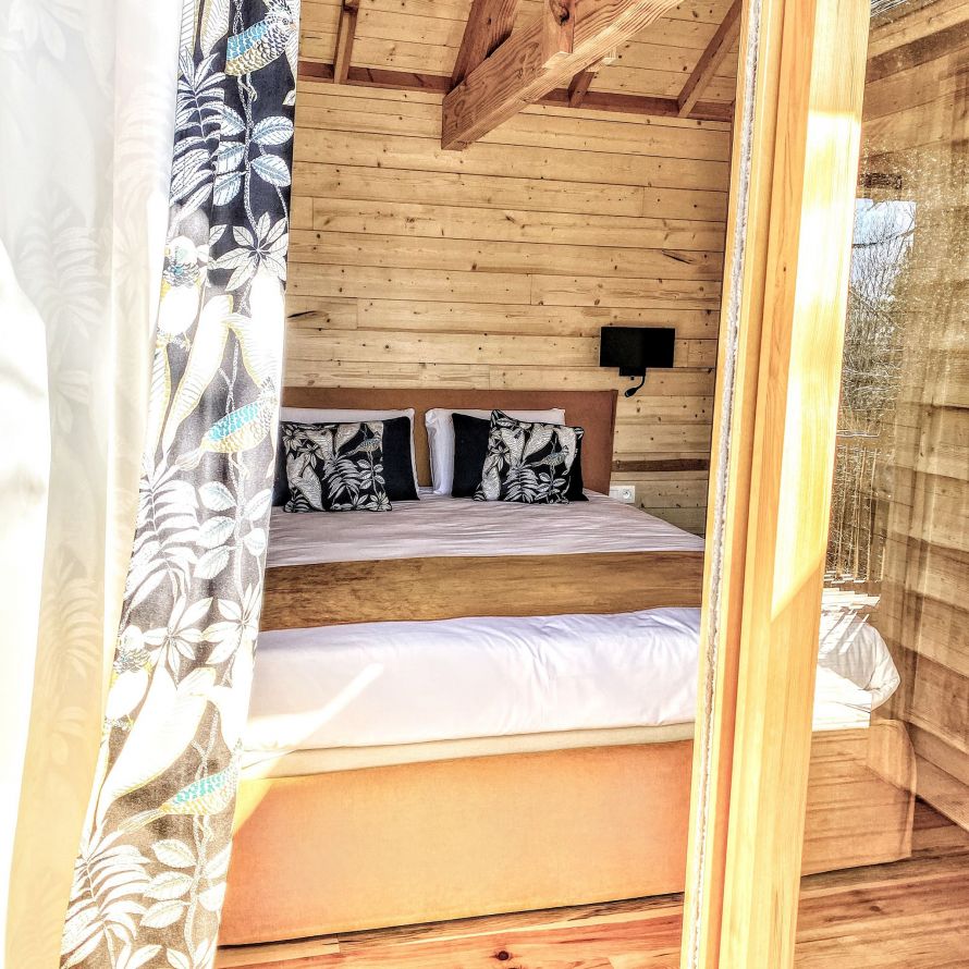 Toutes perchées en surplomb du parc, chacune possède une terrasse avec salon extérieur, un coin salon à l’intérieur et une salle de bain au confort moderne.