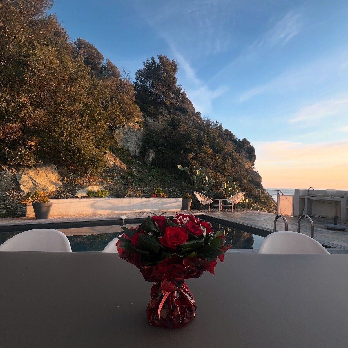 À l’extérieur : piscine privée non chauffée avec vue mer, douche extérieure, terrasse aménagée avec salon de jardin et table pour 8, cuisine extérieure avec plancha et barbecue au charbon.