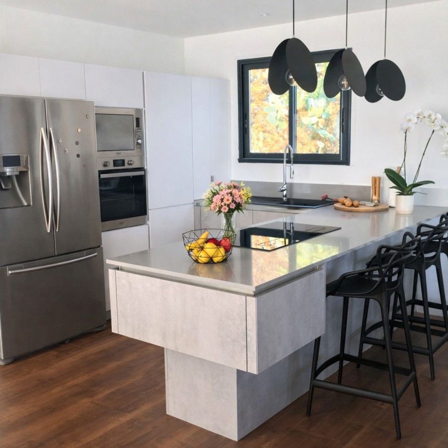 L’espace de vie inclut un salon convivial et une cuisine américaine bien équipée, une buanderie avec lave-linge et sèche-linge, un cellier et une cave à vin.