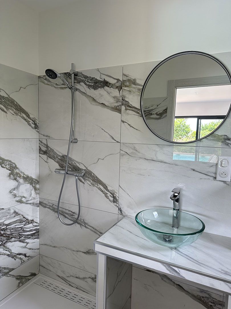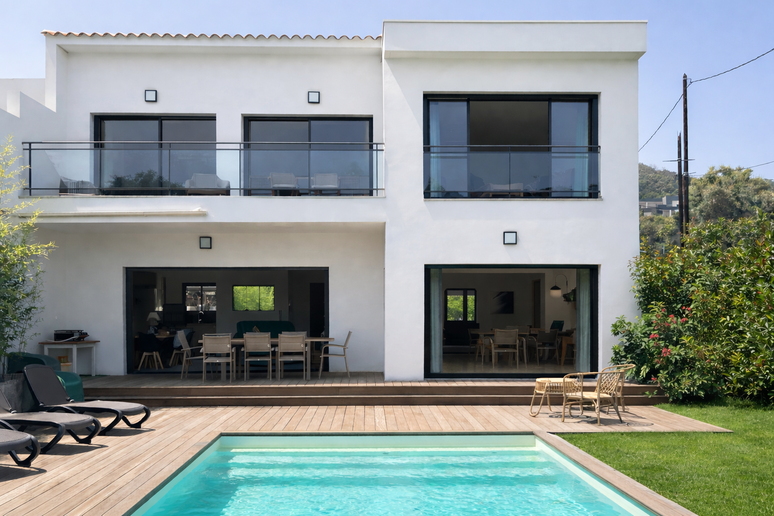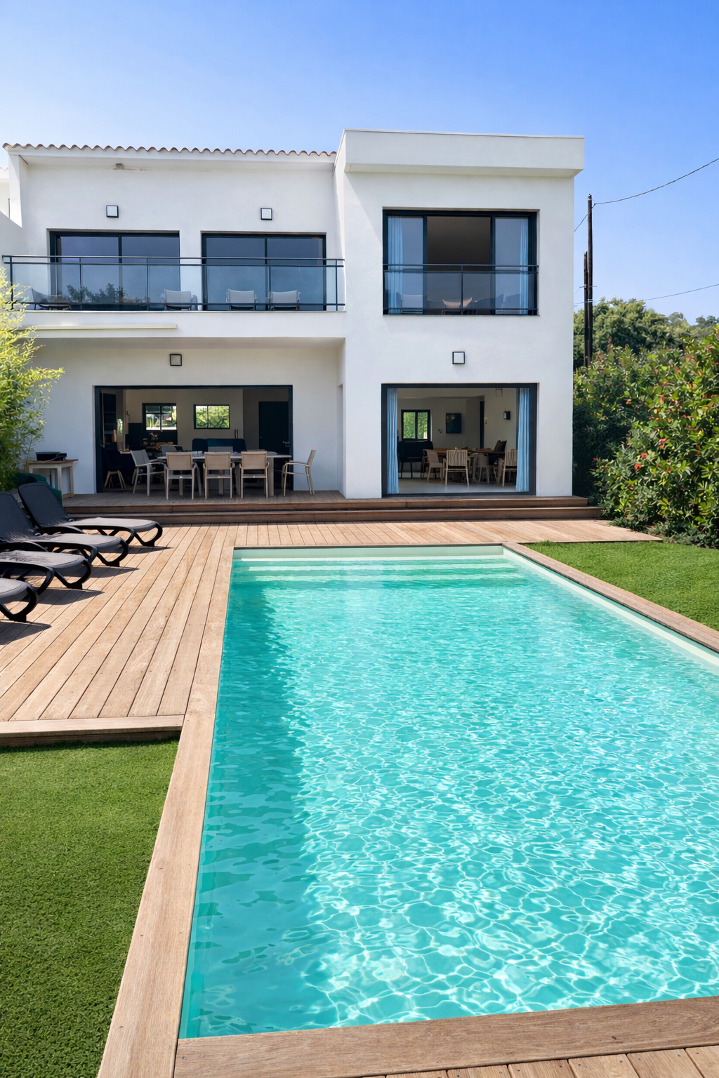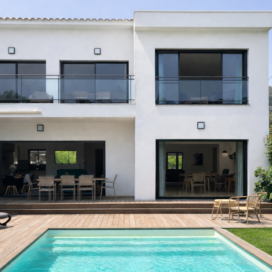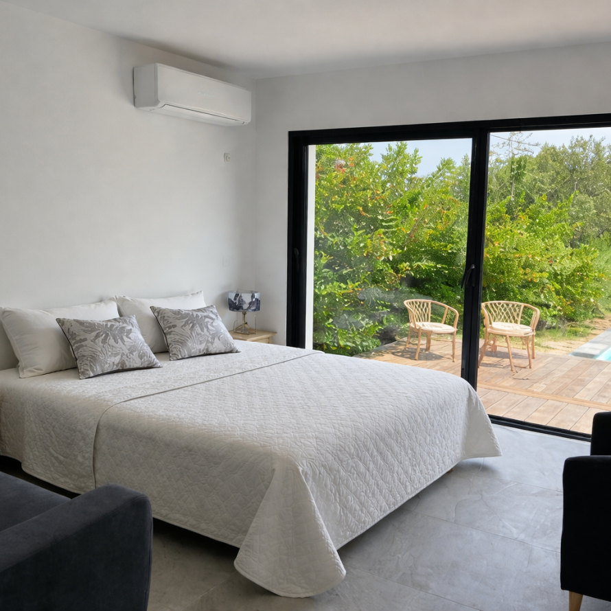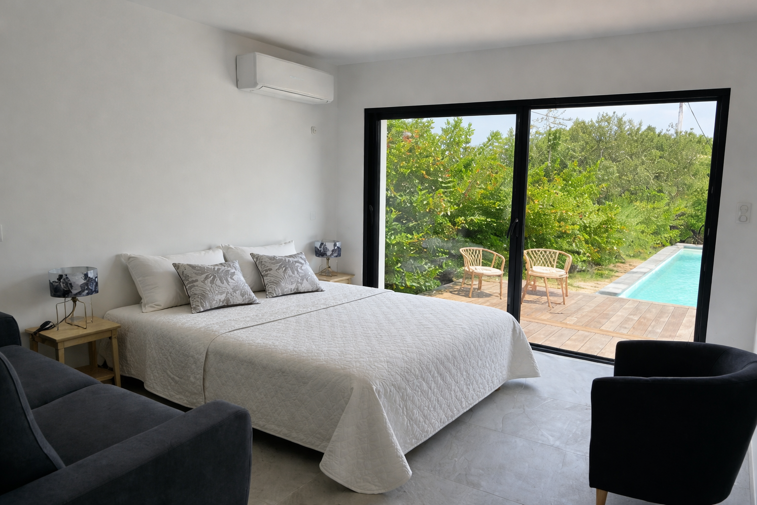 La chambre principale bénéficie d’une vue directe et d’un accès à la piscine, ainsi que de sa salle de bain privative pour un confort optimal. -