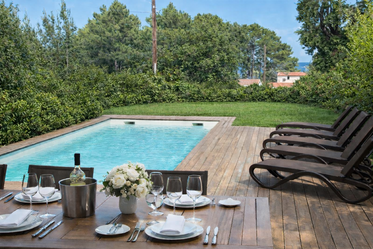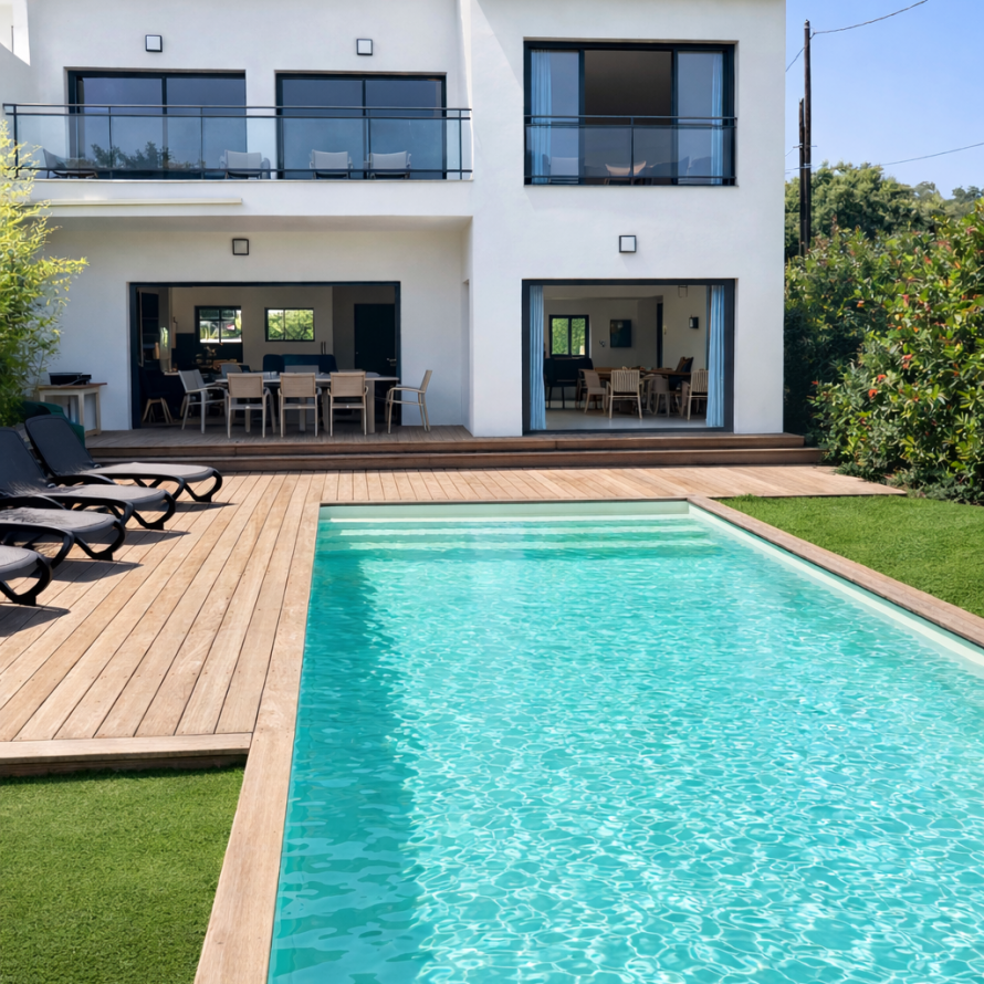 À l’extérieur, une spacieuse terrasse en bois de 90 m² et une piscine chauffée (sur demande) vous invitent à la détente.